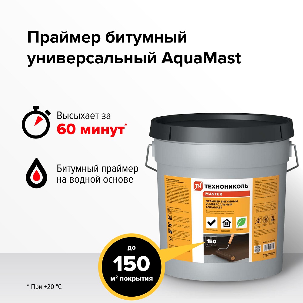 Праймер Технониколь AquaMast — это универсальный морозостойкий битумный состав на водной основе, который обеспечивает надёжное сцепление между поверхностью и гидроизоляционными материалами.