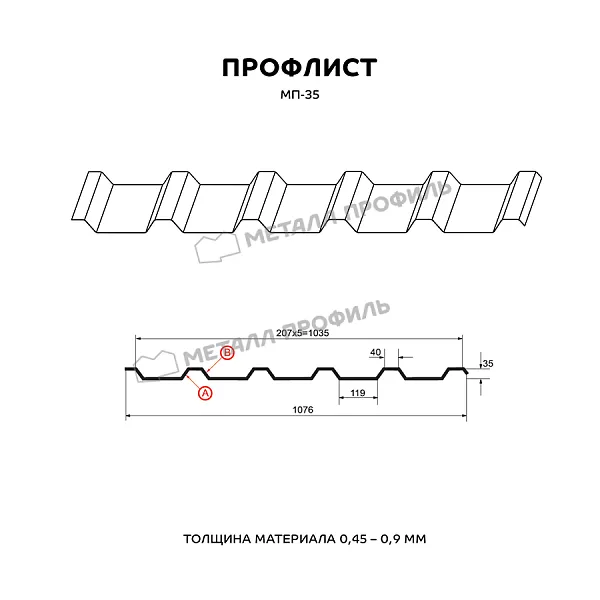 Профлист МЕТАЛЛ ПРОФИЛЬ МП-35x1035-B (VikingMP-01-7024-0,45) широко применяется для обустройства профилированного листа. Изначально он представляет собой лист оцинкованной стали с покрытием. Общая толщина стальной основы с цинковым и полимерным слоем составляет 0.45 мм. Проходя процедуру холодного проката, сталь приобретает рисунок из ритмичных волн. Такая форма придает профилю несущую способность.Профиль МП-35: