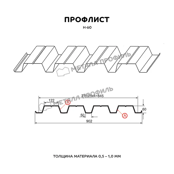 Описание товара: "Профнастил Н-60 x 845 A NormanMP ПЭ 01 8017 0,5 мм"
