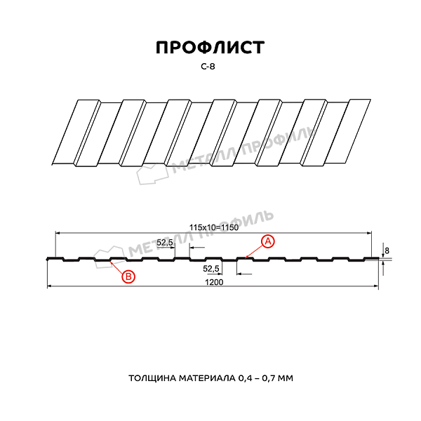 Профиль С-8:С-8 – наименее рельефный и экономичный профиль. Его несущая способность сравнительно невелика, поэтому такой профнастил не используется в конструкциях, где необходима высокая жёсткость. Чаще всего С-8 используют в качестве стенового облицовочного материала, а также для возведения ограждений и монтажа потолков. Характеризуясь маленькой высотой – всего 8 мм – одновременно он имеет максимальную полезную ширину – 1150 мм. В основном на производство С-8 идёт металлопрокат толщиной от 0,4 до 0,7 мм. Это подходящие параметры для обшивки фасадов или устройства заборов в районах с отсутствием порывистых ветров. Для временных конструкций (времянок, сараев, бытовок, туалетов) в Компании Металл Профиль можно купить профлист без полимерного покрытия толщиной 0,35 и менее мм, чтобы сэкономить, когда есть необходимость.