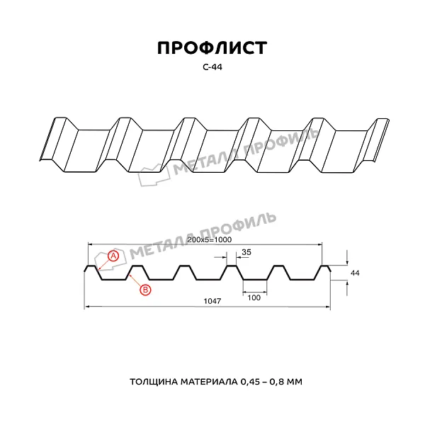 Профилированный лист С-44 может быть использован практически в любых сферах строительства. Этот профиль в равной степени востребован как в гражданском секторе, так и на индустриальных объектах. Профилированный лист с глубиной гофры 44 мм характеризуется очень высокими несущими показателями. Это самый высокий из профилей с наименованием С – «стеновой». Он незаменим, если вам необходимо: соорудить подсобные помещения, сделать кровельное покрытие, поставить забор, установить стены и перегородки в щитовых зданиях. Помимо этого С-44 отличается подходящей прочностью для строительства каркасов зданий и несъёмной опалубки для железобетона. Профиль С-44 смело можно применять в областях с суровым климатом. Стороны этого профиля несимметричны. Верхняя часть (А) имеет более ритмичный рисунок из узких полочек и рекомендована для кровли. Сторона В смотрится более монолитно, подходит для всех остальных сфер применения.Покрытие Полиэстер:
